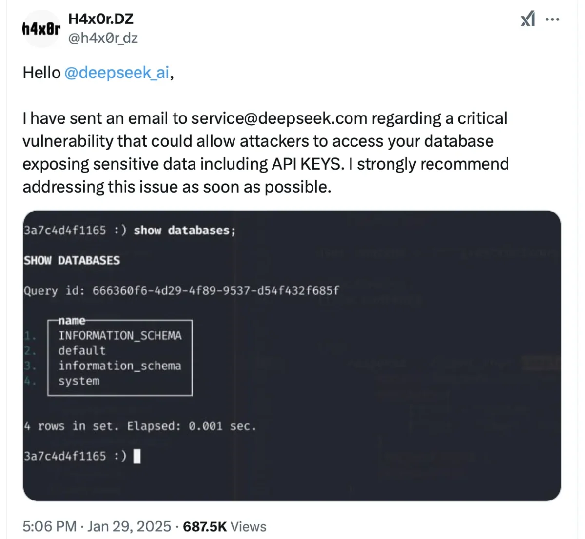 One of the security researcher also submit a vulnerability to DeepSeek on X platform.