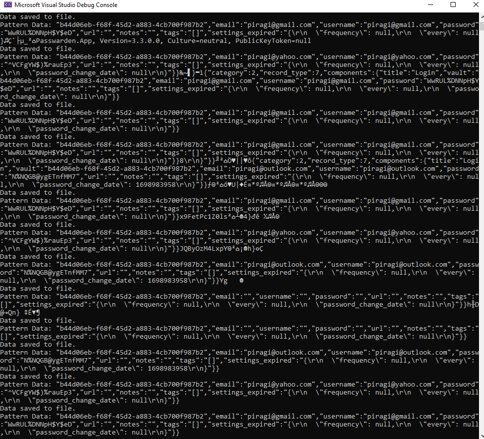 For Ironvest the relevant webapp must be up. Since this password manager does not require the master password from the user when it opens and keeps them auto logged-in, I started the Chrome from cmd, by visiting “ironvest.com/app”. Then, I used the tool to extract all entries. The following screenshot illustrates this issue. Since entries are stored multiple times, they are dumped each time the tool identifies them within the dump file.