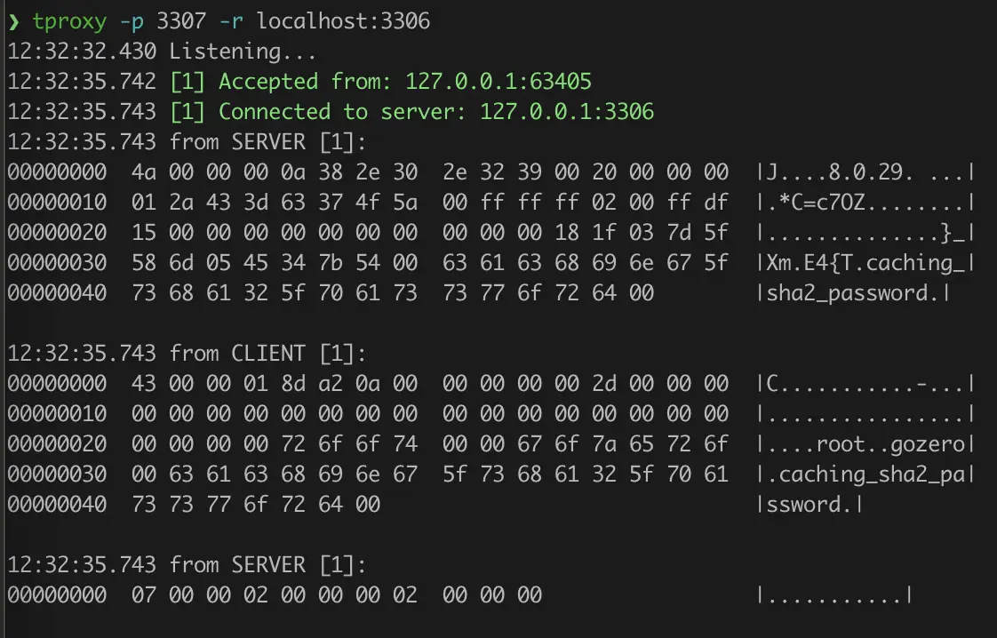 $ tproxy -p 3307 -r localhost:3306